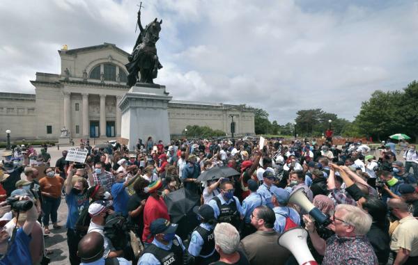 27 giugno 2020. Una folla inferocita di militanti di Black Lives Matter ha preso d’assalto la statua di San Luigi IX, Re di Francia, che campeggia a Saint Louis, capitale del Missouri. Al suon di tamburi tribali, i manifestanti hanno gridato anche oscenità e utilizzato bombolette di vernice per vandalizzare il monumento.