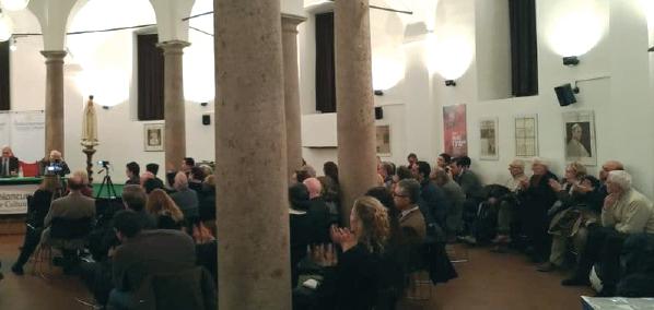 Presentati da Julio Loredo, presidente dell’Associazione Tradizione Famiglia Proprietà, hanno parlato il prof Massimo de Leonardis, cattedratico di Storia delle relazioni internazionali all’Università Cattolica del Sacro Cuore di Milano; il dott Ettore Gotti Tedeschi, banchiere ed economista; e il prof Roberto de Mattei, presidente della Fondazione Lepanto Una copia della statua pellegrina internazionale della Madonna di Fatima presiedeva l’atto, rammentando che siamo nell’anno del centenario delle apparizioni