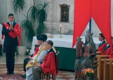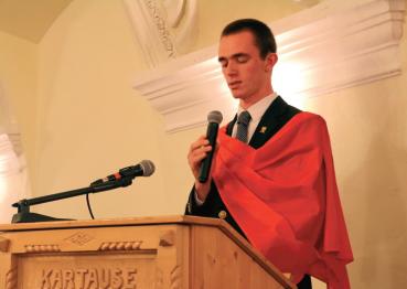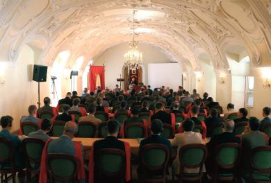 In senso orario: solenne Messa dell’Assunta nella chiesa della Certosa di Gaming; parla il rappresentante dell’Africa del Sud; la cena conviviale di chiusura