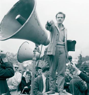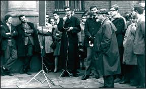 A dx., vestito da prete, Mario Capanna parla agli studenti nell’Università Cattolica del Sacro Cuore, a Milano