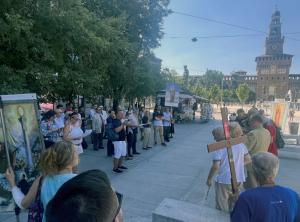 Domenica 29 giugno, Festa di San Pietro e San Paolo, davanti al Castello Sforzesco, una sessantina di coraggiosi cattolici milanesi hanno affrontato il torrido caldo, che sfiorava i 38°, per pregare in piazza un Rosario di riparazione per il cosiddetto “pride” omosessuale, tenutosi in città il giorno prima. L’atto è stato organizzato da un insieme di associazioni cattoliche del territorio.