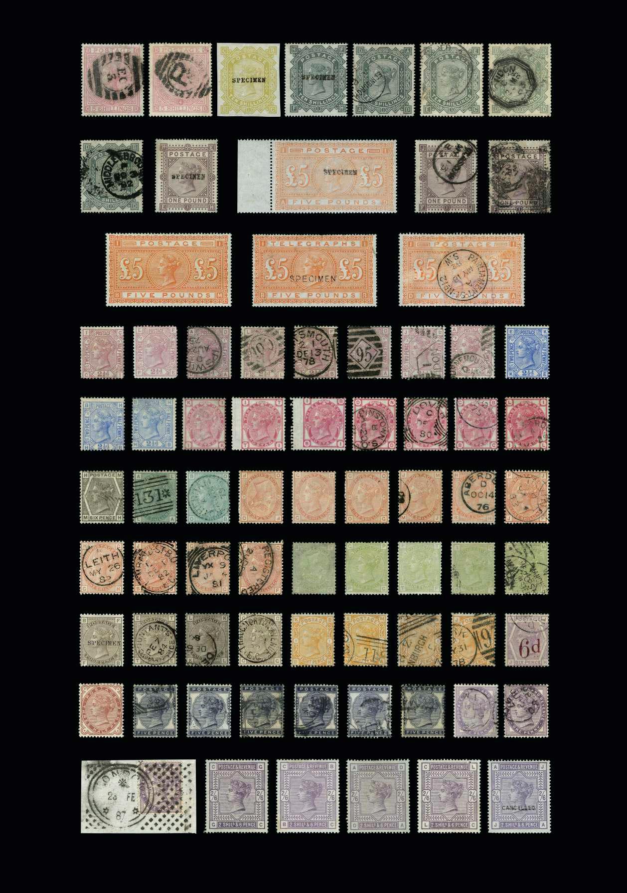 26865 28 1857-67 QV - 1d dull vermillion, wmk double lined ‘1’, imperf, 3 large margins, extremely close at top. Fine used, h/r. Cat. £38 {U} £15 26866 34 1857-67 QV - 2d slate-green, wmk double lined ‘2’, imperf, 4 margins. Fine used, h/r, cancelled with barred oval ‘26’. Cat. £100 {U} £48 26867 37 1857-67 QV - 4d blue, wmk double lined ‘4’, imperf. 2 copies (shades), 4 margins and 2½ margins. Good used, h/r. Cat. £60 {U} £20 26868 1858-1912 Balance collection on leaves ex SG ‘NEW IMPERIAL’ Album, spanning 1858 to 1912. Mixed, mint and (mainly) used, note QV octagonal ranges to 6d, Chalon head 1d x2 (handrwritten dated cancellations), 1871-79 ranges to 8d, 1892 mint set to 1s (ex 10d), 1899 views used (½d mint) plus perf variations, 1880 Stamp Duty set. Mixed condition, generally above average including fine. Estimated catalogue value £500. 45 stamps, useful to develop, fill gaps/runs. Includes odd damaged/toned but not included in estimate. {CC} £150 26869 48 1860-67 QV - 6d slate-violet, wmk double lined ‘6’, imperf, 4 good margins. Average used, h/r, surface rubbing. Cat. £80 {U} £25 26870 57-59 1863-71 QV - 1d in all 3 shades, wmk double-lined ‘1’, used, h/r. Dated manuscript cancellations in ink. Some rough perfs and all o/c. Cat. £175 {U} £70
