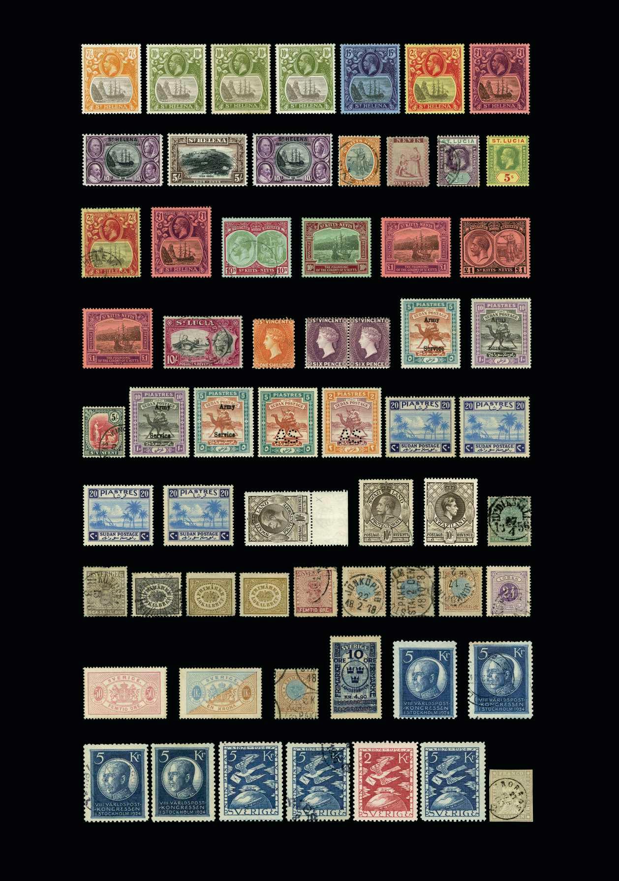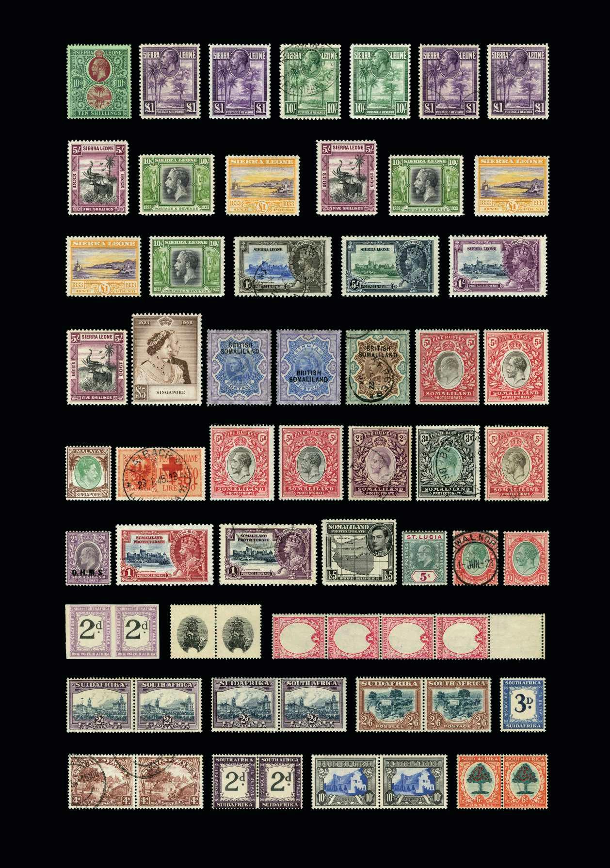 26953 76 1913 GV wmk MCA 2/6d black & red ob blue very fine u.m. Small gum adhesion. Cat. £50 {UM} £25 26954 76 1913-19 KGV - 2s.6d black and red/blue, wmk Mult Crown CA, perf 14. Lightly MM, h/rs. Cat. £50 {MH} £22 26955 82-85 1922-28 KGV - set of 4v to 5s, wmk Mult Crown CA, perf 14. 3d, 1s, 2s.6d & 4s. Lightly MM, h/r. Cat. £50 {MH} £25 26956 110-21 1938 GVI definitive set being the much scarcer chalky paper with ordinary paper extras of ½d, 1d, 2½d, 3d & 1/-. M.m. (17). Cat. £200 {MH} PH Plate 55 £100 26957 110-21 1938-47 GVI definitive set cds used, ordinary paper set, plus extra ½d1/- chalky paper. (20). Cat. £80 {U} £45 26958 136-47 1952 GVI defintive set very fine l.m.m. (12) Cat. £55 {MH} £28 26959 136-47 1952 GVI defintive set very fine used (12) Cat. £80 {U} PH Plate 55 £50 26960 149-61 1956 QEII definitive set with extra ½d & 1d shades top 2 barely a trace l.m.m. rest u.m. (15). Cat. £130 {MH} £65 26961 178-92 1964 QEII set very fine l.m.m. top 3 u.m. (15). Cat. £85 {MH} PH Plate 53 £50 26962 178-92 1964 QEII set very fine cds used. (15). Cat. £55 {U} £35