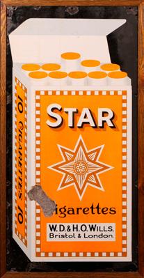 43 Tobacco - a shaped pictorial shop display showcard, Wills’s Bulwark Cut Plug, printed and illustrated with a gentleman smoking a pipe and labelled tobacco packets, 50.5cm high, c.1930