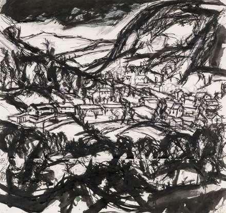 ‡ CERI RICHARDS CBE pencil, pen, brush, black ink and gouacheentitled verso, ‘Homage to Dylan Thomas’ on Kooywood Galley label, signed, 35 x 52cms