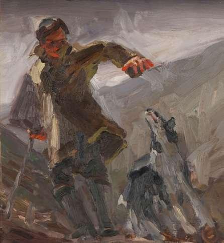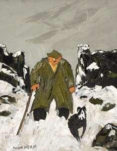 ‡ OWEN MEILIR oil on card - farmer and sheepdog walking through the snow, signed, 35 x 27cms