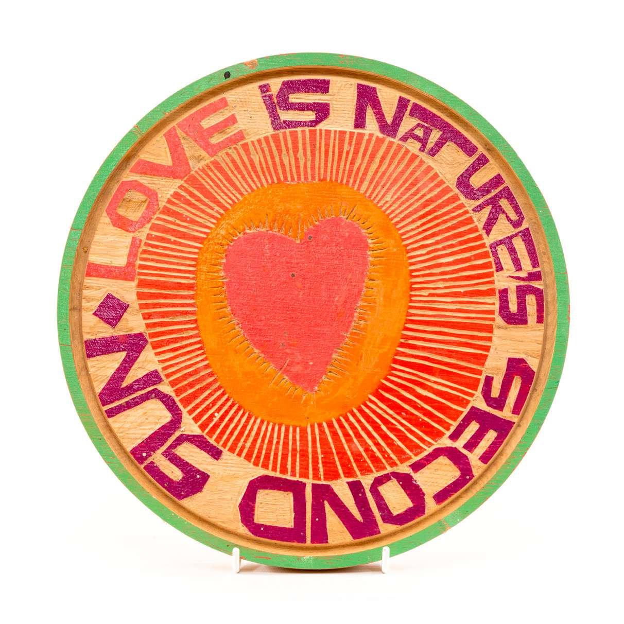 ‘Love is Nature’s Second Sun’, with artist’s studio sticker verso, 28cms (diam.)