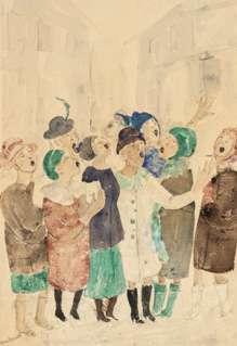 ‡ VERA BASSETT watercolour - a group of ladies singing in the street, signed, 54 x 37cms