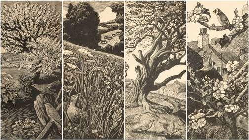 ‡ CHARLES FREDERICK TUNNICLIFFE OBE RA woodblock prints - set of four, each depicting a bird in its natural habitat, Cuckoos, Corn Crakes, Goldfinches and Fieldfares, all signed with initials and dated 1933, all 14 x 9cms