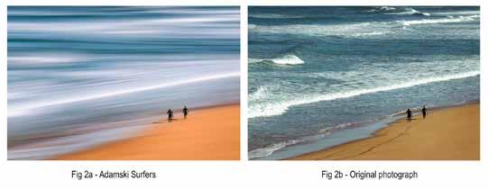 The second example, “Adamski Surfers”, shown in Figure 2, is my first attempt at this technique, based on a photograph I took at Logan’s Beach in Warrnambool. Figure 2 also shows the original photograph.