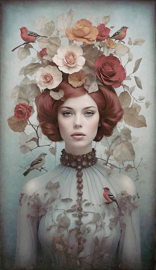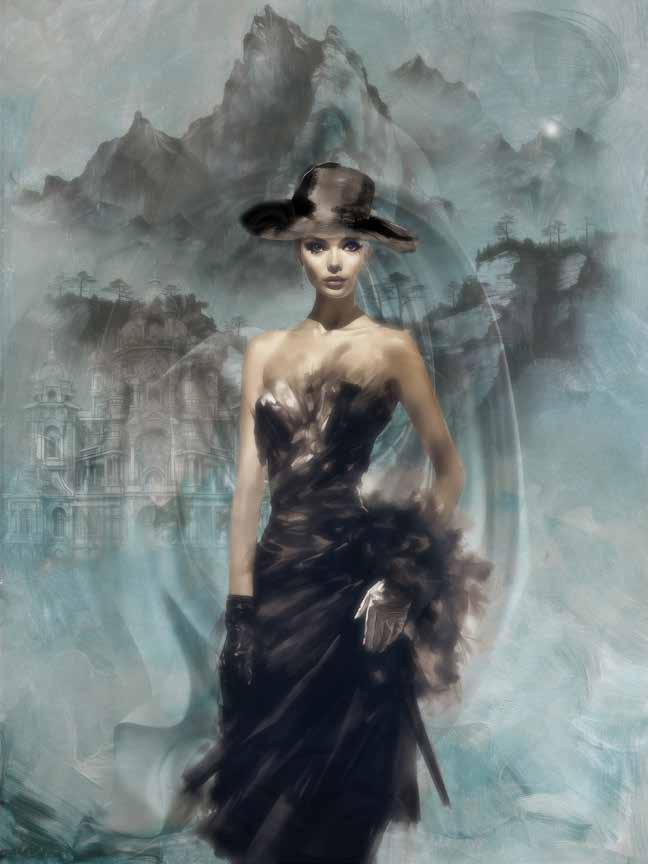 To be honest I’m not a planner, I choose a photo to start with and then play by adding various elements, textures and effects until it suddenly starts coming together. I sometimes work on an image over several days before I’m completely happy with it. I use a variety of adjustment layers and like to add some dodge and burn. I also use Topaz Studio 2 to add some painterly effects. Recently I have dabbled with Mid Journey to create some of my models. I work with a Wacom tablet and a MacBook Pro computer.