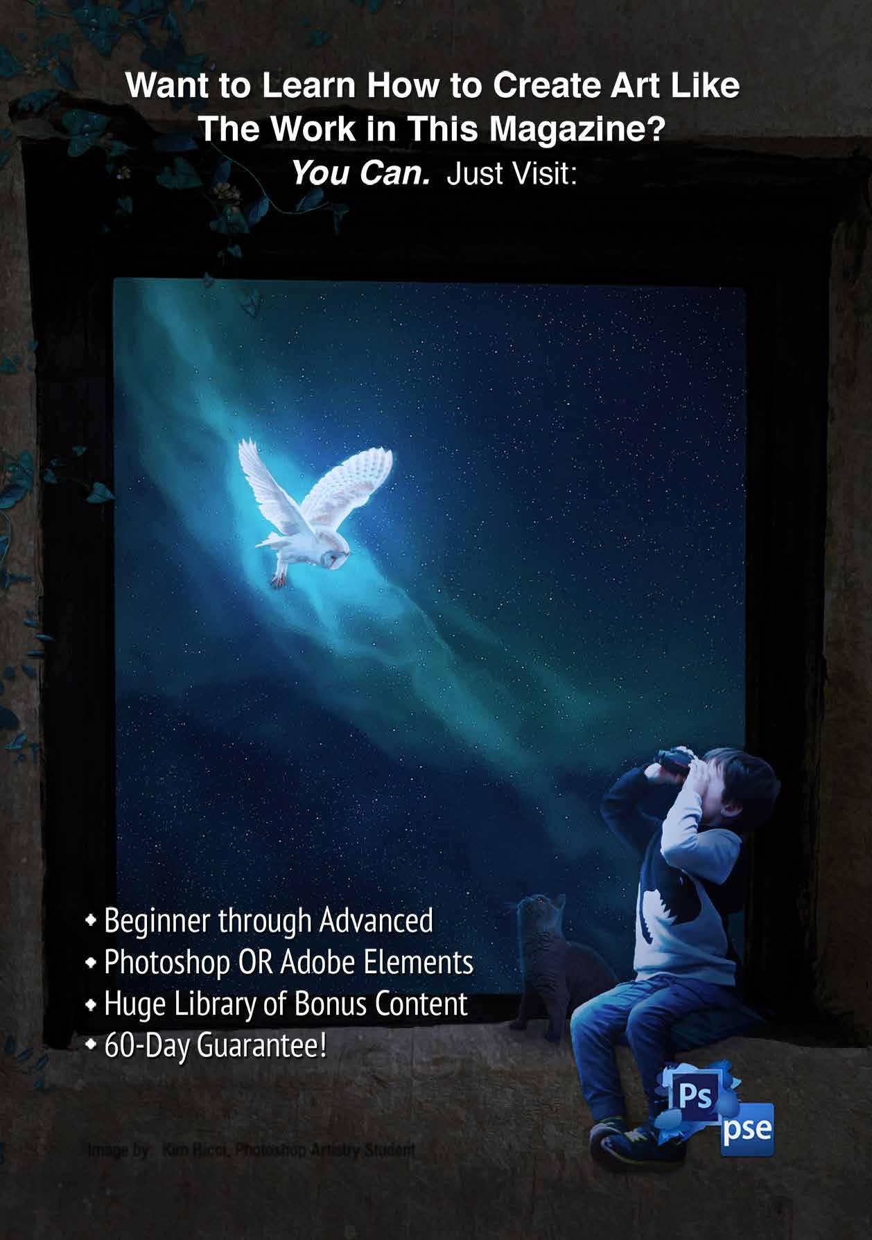 I do really enjoy learning. Photoshop is forever changing, which can be challenging at times, but well worth the effort. I look forward to the new tutorials each month and will often start an image straight after watching one to try out a new technique.