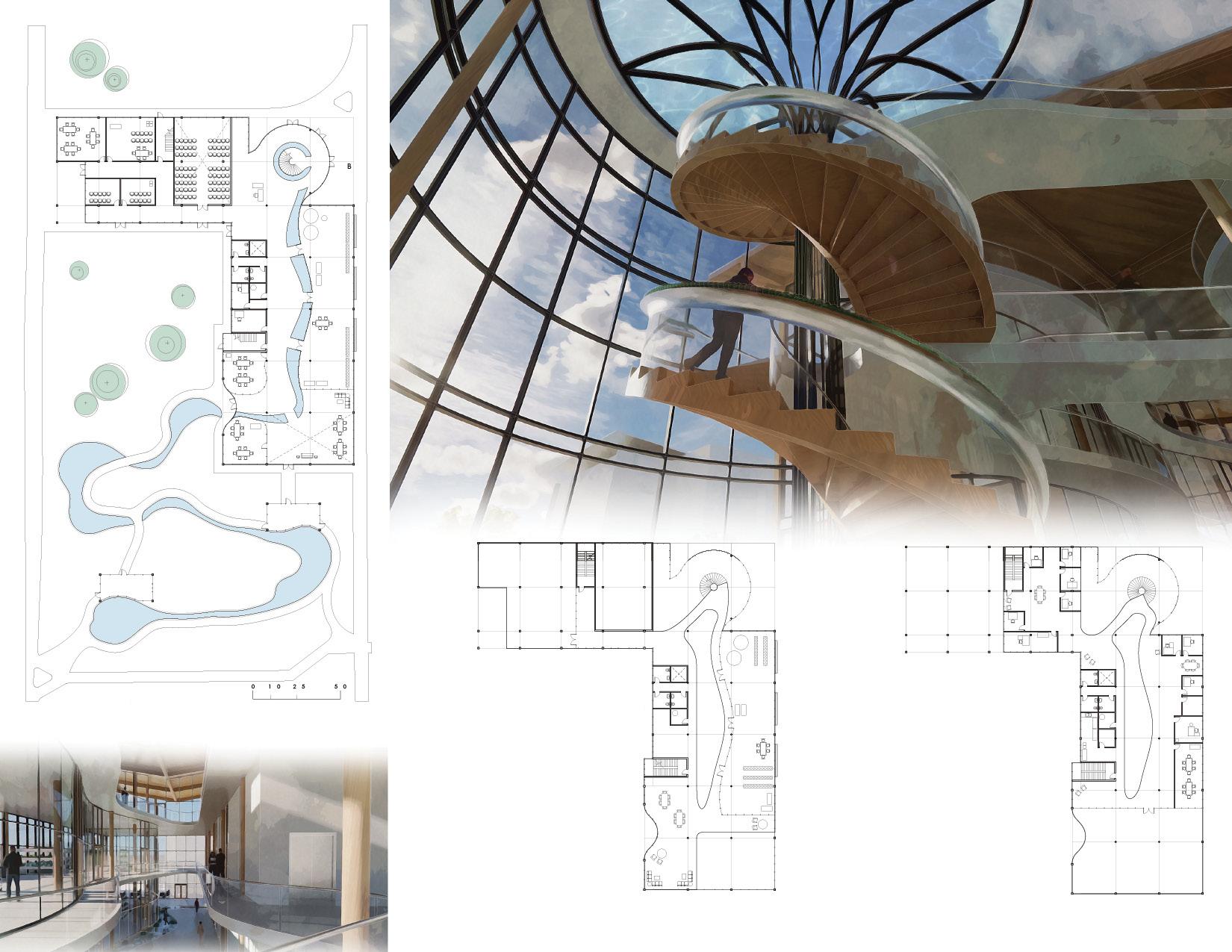 The aim of this research center is to provide an immersed educational opportunity in explorations on the potentials of different relationships between plants and water. Through research in hydroponics and water remediation, clean and sustainable foods can be sourced and potable water can be made. Just as water is key in cultivating plants, plants can be used to cultivate clean water. The labs and systems both inside and outside of this facility will dive into how hydroponics and water remediation can be used together to create a “living machine,” and display to the public how these processes work within closed and open, interior and exterior systems.