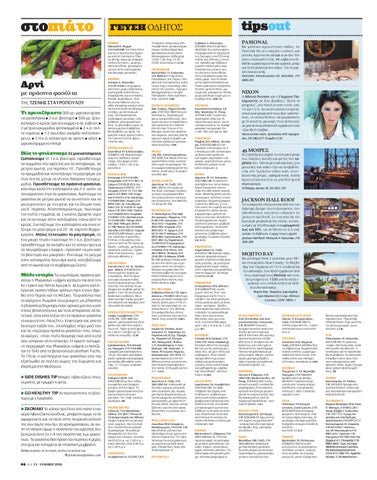 γωγή» από το “Box” των Εξαρχείων και το “Εva’s Garden” της Φολεγάνδρου. Απλές μεσογειακές γεύσεις, πρωί - μεσημέρι - βράδυ, καλό κρασί και πρωτότυπα cocktails, τα περισσότερα δικές τους εμπνεύσεις. Μουσικές soul, jazz και rock. Ανοιχτό κάθε μέρα από 7.00, Σ/Κ από τις 12.00 μ.μ. Μ Ξ ROSEBUD Σκουφά 40 & Ομήρου, 210 3392.370, www.rosebud.gr