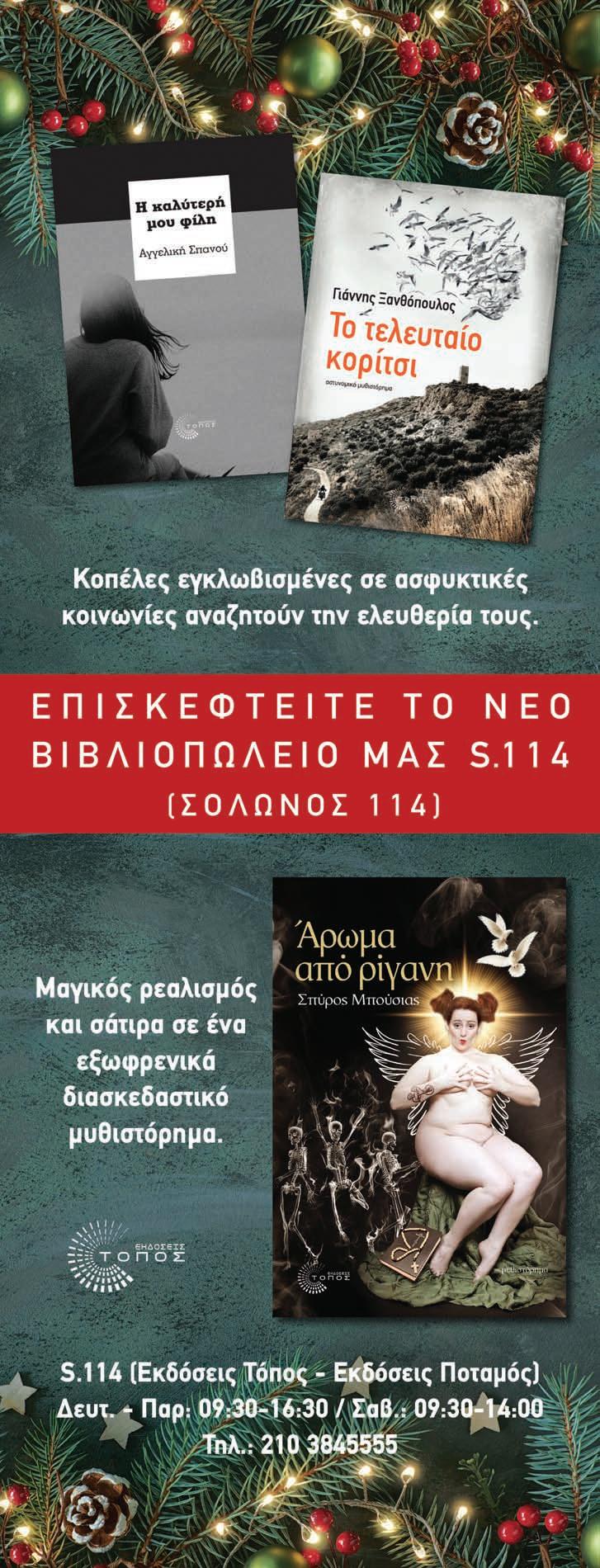 Κεντρι Κ ή Διάθεσ ή Xαριλάου Tρικούπη 22, 106 79 Aθήνα, 2103617170 (εσωτ. 114), fax: 2103617310 Παραγγελίες on-line: athensvoice.gr/athens-voice-books Ένα βιβλίο για τη ματαίωση, την απώλεια – και τη λύτρωση. Ένα άναρχο υβριδικό Lesbo-Western που δεν θέλει να έχει καμία λογοτεχνική αξιοπρέπεια. Όλα στα μούτρα! Αλκιβιάδης Παύλου. Ένας άριστος με ματαιωμένο πεπρωμένο, ηττημένος από «μάγκες» αχρείους και μέτριους με κονέ, προδομένος από τον δύστροπο χαρακτήρα και την έπαρσή του. Αλκιβιάδης Παύλου. Χήρος (και σιωπηλά ενοχικός για το πώς της φέρθηκε μέχρι και το τέλος), με σχέση οδυνηρά ανύπαρκτη με τον γιο του και μόνη ηλιαχτίδα τη μοναχοκόρη του. Θα ζήσει την τραγωδία και, αναπάντεχα, θα αναζητήσει τη ζωή, δημιουργώντας νέα αρχή. Γιατί και στο βαθύτερο σκοτάδι υπάρχει φως. Γιατί και την τελευταία στιγμή υπάρχει χρόνος. Προσχέδιο σύγχρονης τραγωδίας ή σκαλέτα κινηματογραφικής ταινίας, το θραυσματικό «Μαρία και Στέλλα» του βραβευμένου από την Ελληνική Ακαδημία Κινηματογράφου και το Φεστιβάλ Κινηματογράφου Θεσσαλονίκης κινηματογραφιστή, ζωγράφου και συγγραφέα Άγγελου Σπάρταλη είναι και κάτι σαν ένα σύγχρονο –κάπως άκομψο– «Ρωμαίος και Ιουλιέτα». Κωνσταντίνοσ Καμαρασ τελίΚή τεθλασμενή Μυθιστόρημα aγγελοσ σπαρταλήσ μαρία Καί στελλα Μυθιστόρημα CHRISTMAS GUIDE 2022 13