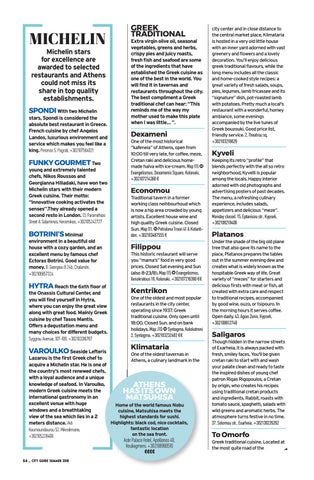 stars, Spondi is considered the absolute best restaurant in Greece. French cuisine by chef Angelos Landos, luxurious environment and service which makes you feel like a king. Pirronos 5, Pagrati, +302107564021