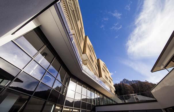 schon geht es los! Der Blick auf die umliegende grandiose Berglandschaft der Westalpen und den Latemar ist einmalig. Daher auch die Entscheidung des Architekten, Walter Pichler, Landschaft und Licht in das Hotel hinein zu holen und den neuen Trakt mit großen, bodenbündigen Fensterflächen zu gestalten. Ergebnis: Tageslicht überall im Hotel und mit jedem Schritt ein grandioses Panorama vor Augen. Sogar eine Sauna mit Blick auf die Piste gibt es; Spezialfenster schützen die Saunagäste vor neugierigen Blicken. Auch wer im Fitnessraum schwitzt oder nebenan Joga oder Pilates macht, hat das UNESCO-Welterbe der Dolomiten vor Augen.
