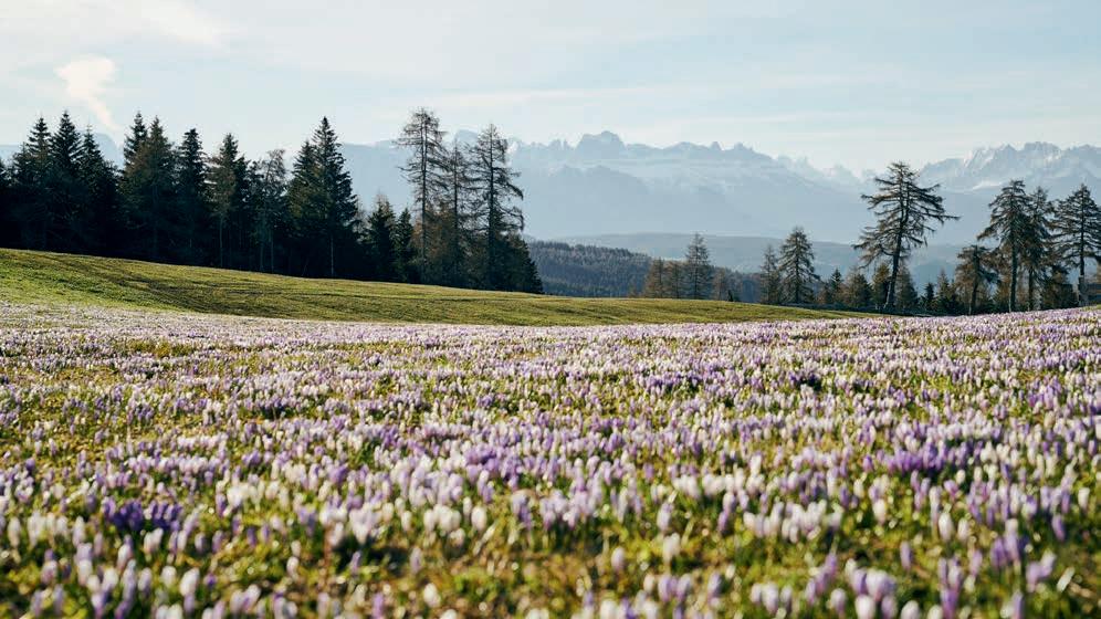 „Gelaterie“ (Eisdielen) und feine Restaurants. Herz, was willst du mehr? Am nächsten Tag wird es noch wärmer. Tatsächlich: Es ist T-Shirt-Zeit. Doch ich habe heute einen anderen Plan. Es geht hinauf in die Höhe. Tschögglberg heisst der Bergrücken, der das Etschtal vom urigen Sarntal trennt. Auf dem Salten, einem Hochplateau zwischen den Dörfern Jenesien und Mölten, unternehme ich eine Wanderung. Auf dem breiten Weg zwischen Lärchen und Wiesen geht es leicht auf und ab, gerade richtig zum Einstimmen auf anstrengendere Touren. Es ist kühler als im Tal, aber der Ausblick auf die umliegenden Berge ist phänomenal. Sogar die berühmten Dolomiten sind von hier aus zu sehen. Plötzlich fällt mir etwas abseits des Wanderweges ein leuchtender Farbteppich auf. Ich nähere mich und komme aus dem Staunen nicht mehr heraus. Krokusse, so weit das Auge reicht! Wie Brüderchen und Schwesterchen schmiegen sich die lila und weissen Frühlingsboten aneinander und bilden ein ganzes Blütenmeer. Der Salten, lasse ich mir sagen, ist bekannt für dieses Naturphänomen, das die warme Jahreszeit auf den Bergen ankündigt.