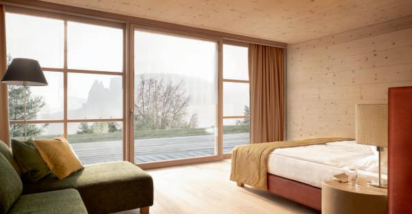 D as Hotel ist das erste in Italien, welches mit dem Gütesiegel „2ECARF-Qualitätssiegel für Allergiker-Freundlichkeit“ ausgezeichnet wurde. Die Natur wurde schlicht und einfach ins Hotel, in jedes Zimmer geholt – Suiten und Zimmer duften nach den verwendeten Hölzern, welche in der Region wachsen und deren ätherische Öle eine entspannende Wirkung hinterlassen.