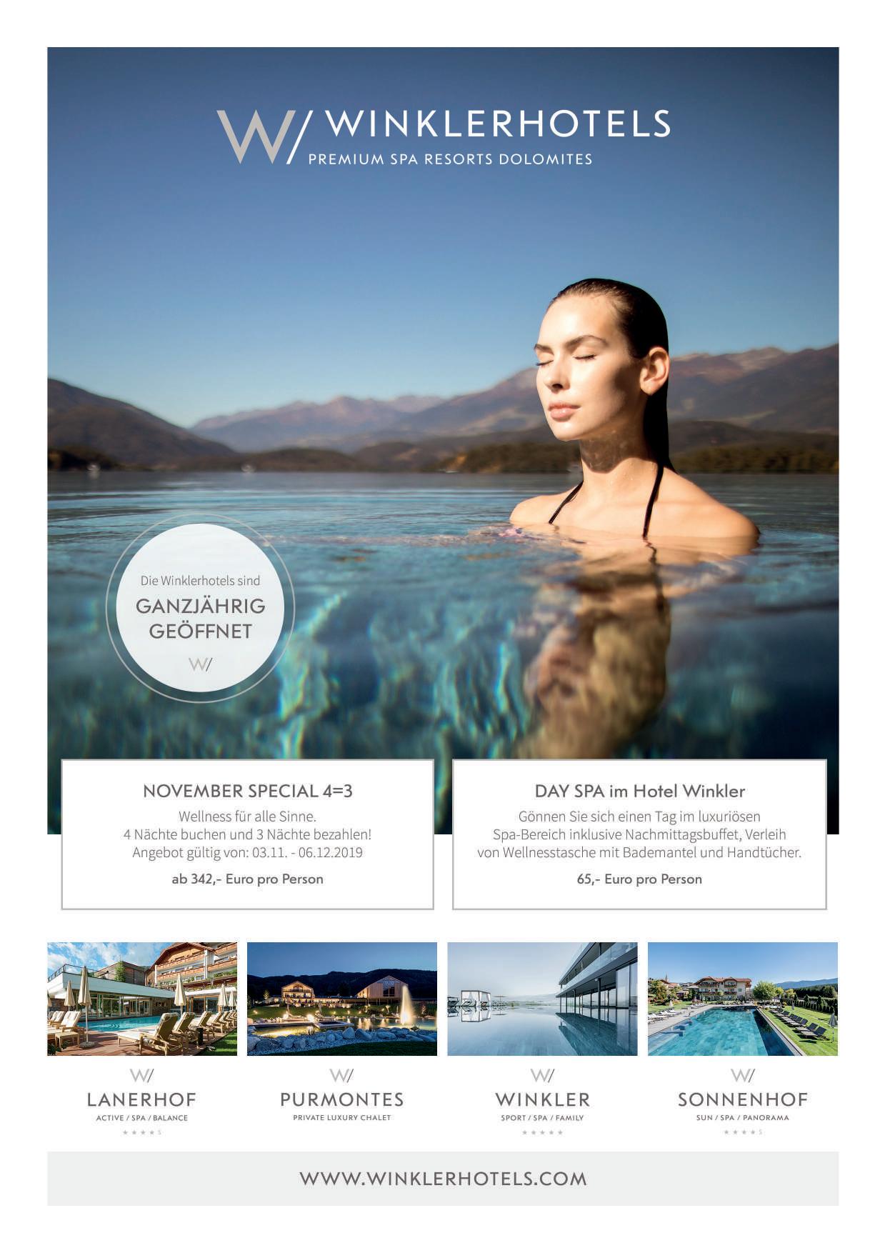 in Pfalzen sollen demnächst generalüberholt werden, um „Qualität für die Zukunft zu sichern.“ 160 Mitarbeiter sind in den vier Winklerhotels tätig, viel Stammpersonal, „einige seit 30 Jahren“, sagt Kurt Winkler. Und betont, dass „wir nur so gut sind wie unsere Mitarbeiter!“ Daher sei geplant, demnächst ein neues Mitarbeiterhaus zu errichten. Neue Kraft schöpft Kurt Winkler auch beim Golfspiel oder beim Wandern, zusammen mit seiner Familie oder mit Freunden. Wandern ist ja auch das Beste, was man in St. Lorenzen und Pfalzen machen kann. Die Auswahl an schönen Spazierwegen ist groß. Neben wandern, ist das Pustertal auch bekannt für die Bikestrecken und schönen Golfplätze.