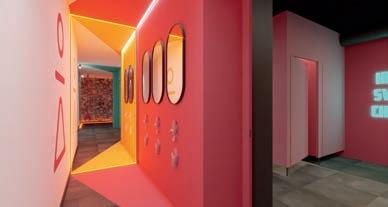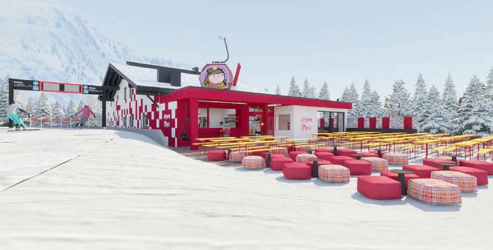 wie Holz und Karomuster in eine moderne Formensprache zu übersetzen. „Uns ging es darum, Tradition nicht zu kopieren, sondern neu zu interpretieren“, sagt Pardeller. „Der Standort hat uns inspiriert, dem Ganzen einen spielerischen, poppigen Touch zu verleihen.“