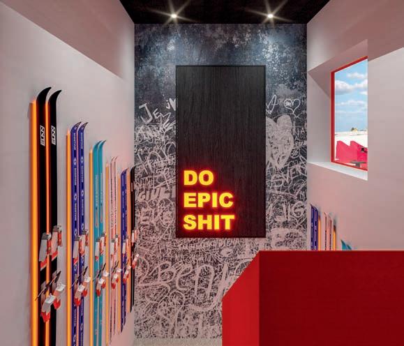 dacht: dunkles Holz, klare Linien und ein leuchtendes Rot, das schon von Weitem auffällt. „Der Kontrast zwischen Nostalgie und mutiger Gestaltung zeigt sich an vielen Details“, so Pardeller weiter. „Wir haben das Holz der alten getäfelten Stube geschwärzt, die Oberflächen neu interpretiert und damit etwas Traditionelles in die Gegenwart geführt. Alte Bilder aus Obereggen treffen auf moderne Sprüche, Ski