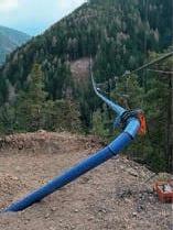 Mit einem Hubschrauber wurde das erste Tragseil über das Tal geflogen. Unterhalb der Geh-Ebene hängt ein Beregnungsrohr, das während der Beregnungssaison von 1. April bis 15. Oktober mit Wasser gefüllt ist.