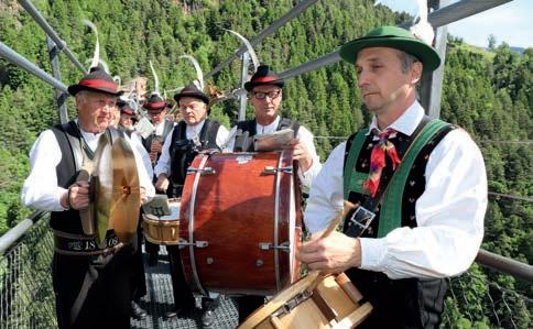 Symbolische Begegnung auf der Brücke: Von beiden Seiten aus – Afing und Vormeswald – gingen bei der Eröffnung der Hängebrücke Abordnungen der Musikkapellen Afing und Sarnthein aufeinander zu und spielten gemeinsam einen Marsch.
