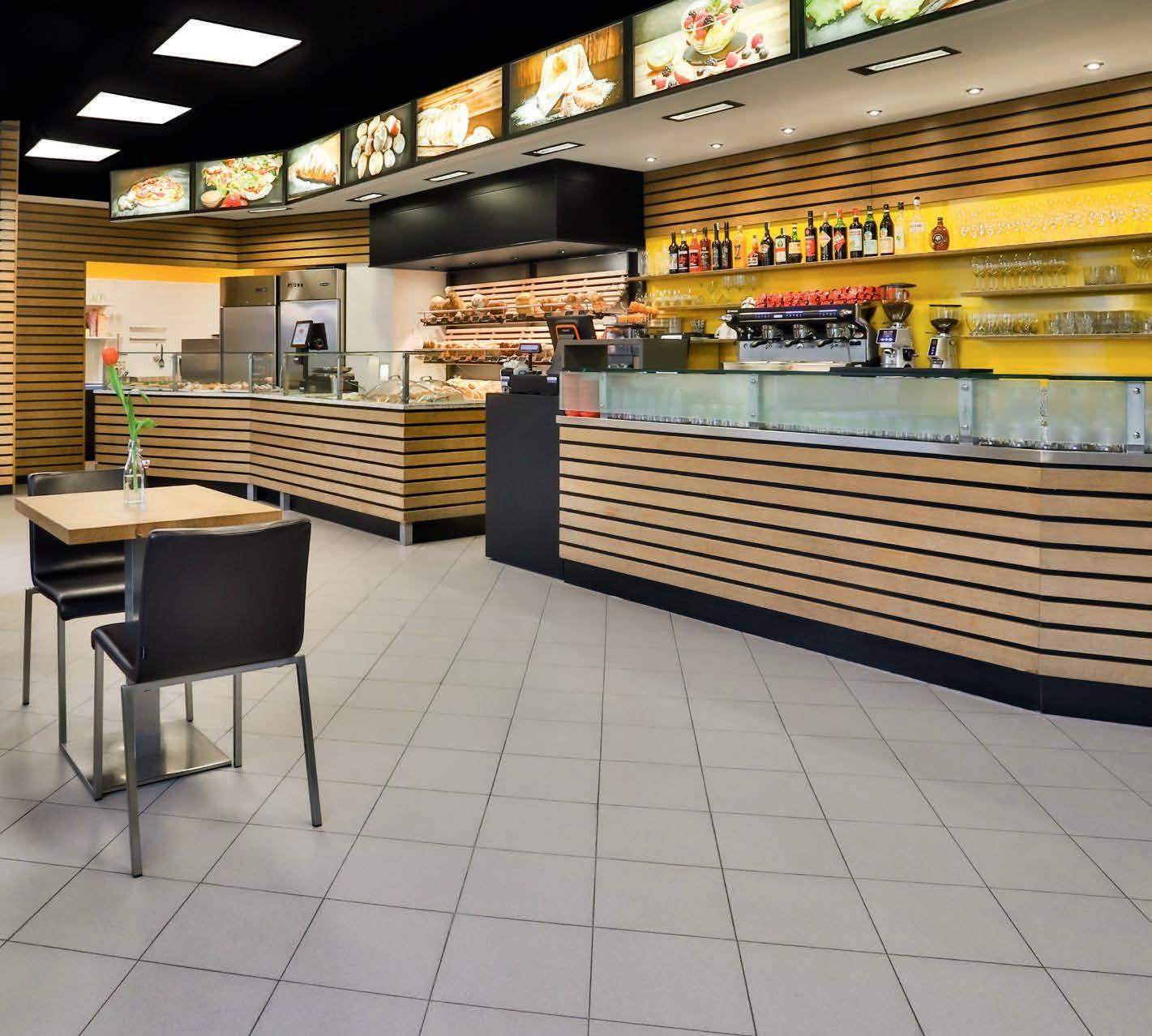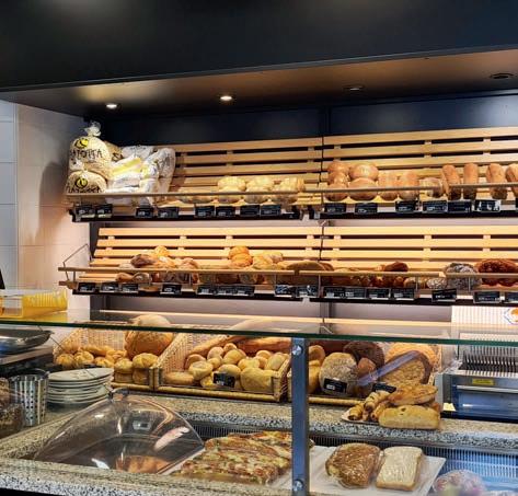 den Farben des Logos des Betreibers, der Eppaner Bäckerei PLAZOTTA. Das Bar-Bistro ist nicht nur ein bei den Kundinnen und Kunden beliebter Verweilort, um sich zwischen den Einkäufen bei einer guten Tasse Kaffee mit Kuchen oder einem kühlen Erfrischungsgetränk zu erholen, sondern bietet auch Snacks und Gerichte für den kleinen Hunger an, von Toast über Baguettes bis zu bunten Salattellern. Und der südseitige Terrassenbereich ist schon längst zum beliebten Treffpunkt geworden, um einen „Aperitivo lungo“ zu genießen.
