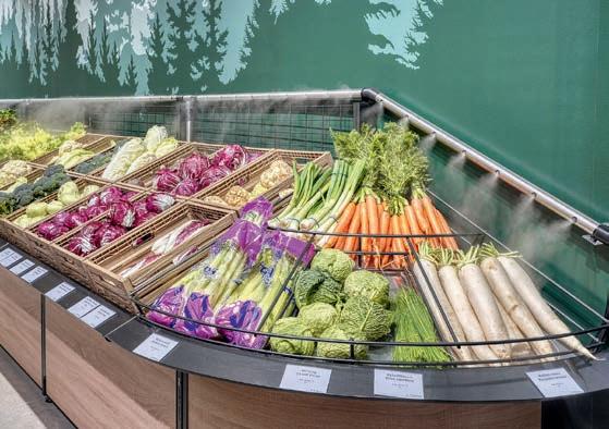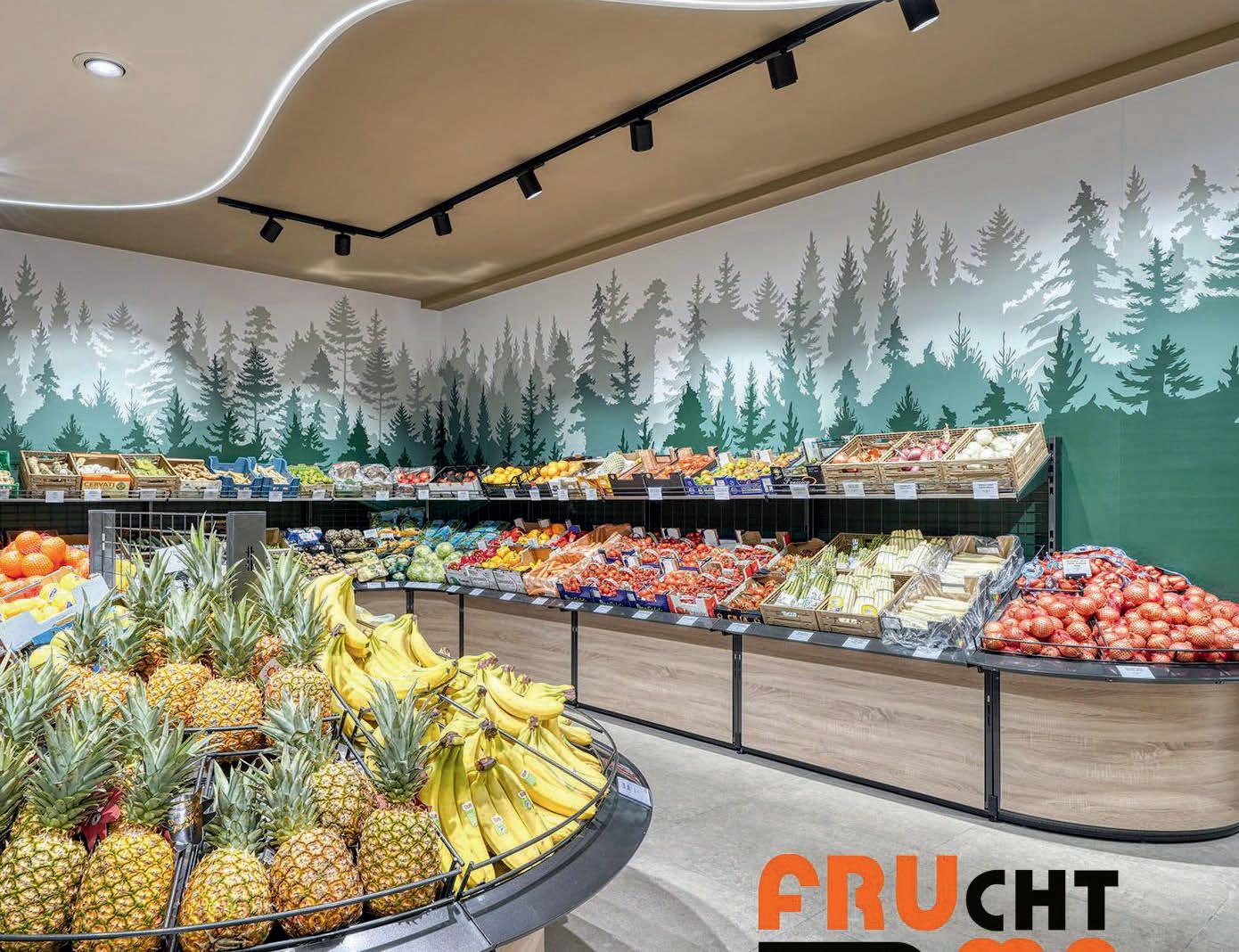 Der Traditionsbetrieb aus Eppan-Frangart war bereits seit Jahren Lieferant der Lebensmittelabteilung des MAXI MODE CENTER und hat jetzt hier seinen eigenen Verkaufspunkt eröffnet. Unter einer weißen Decke mit blauem Himmel, umgeben von einer stilisierten Waldlandschaft werden frisches Gemüse und knackiges Obst der Saison auf offenen Verkaufstischen präsentiert, teilweise ausgestattet mit futuristischen Kühlsystemen wie Edelstahlrohren mit kleinen Nebeldüsen.