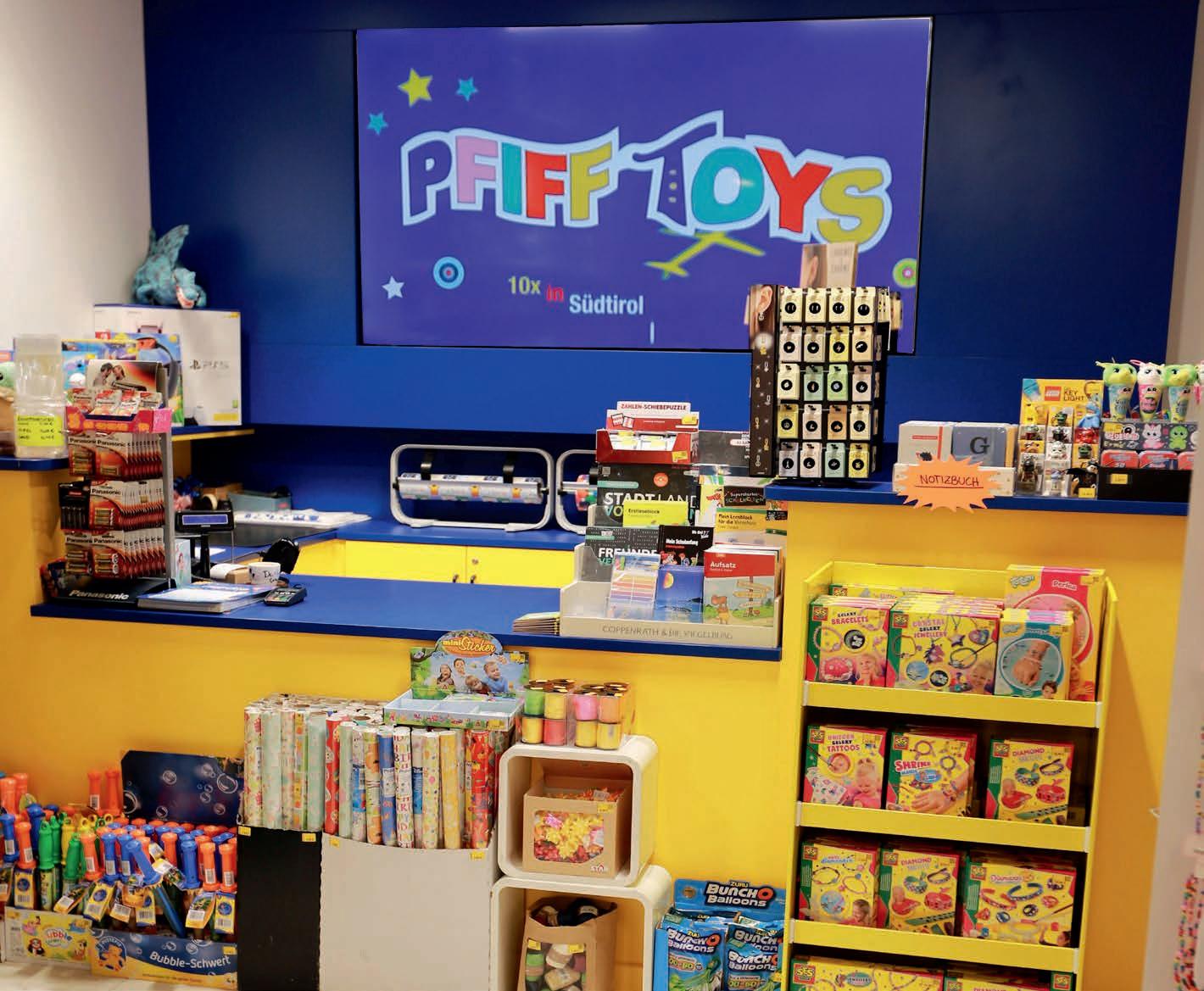 lisiert haben, einige nach neu entwickelten Interior-Kon zepten. Im Erdgeschoss befinden sich nun 4 Geschäfte: der große MPREIS-Supermarkt, der Obst- und Gemüsemarkt FRUMA, MARTIN’S GETRÄNKEMARKT sowie das rundumerneuerte Spielwarenfachgeschäft PFIFF TOYS.
