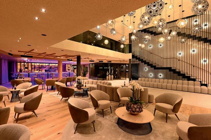 biente von zeitloser Eleganz, das die Natur nicht überformt, sondern in Szene setzt. Ein optisches Highlight ist die neue Lobby mit offener Treppe im Atrium, stilvoller Rezeption und eleganter Bar mit Weinlounge. Der neu gestaltete Restaurantbereich bietet nun Show-Cooking-Stationen, ein umfangreiches Buffet und eine großzügige Terrasse mit spektakulärem Dolomitenblick. Jeder Platz – ob beim Frühstück, beim Aperitif oder beim Abendessen – wird hier zum Logenplatz.
