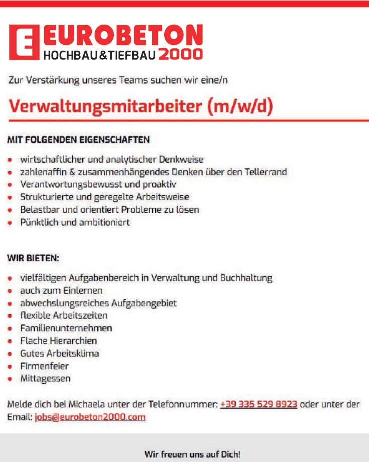 Die KURVERWALTUNGMERAN suchteine/n Verwaltungsassistent/in fürEventsundProduktemit befristetemArbeitsverhältnis (Vertretung vonPersonalin Mutterschaftsurlaub – Vollzeit38Stunden/Woche)mitAufgabeninder UnterstützungbeiderEventorganisationundder Entwicklung von Tourismusprodukten VI.FunktionsebenedesbereichsübergreifendenKollektivvertrages derProvinzBozen Zugangstitel: •Maturadiplom •ZweisprachigkeitsnachweisB2(exB) Persönliche Voraussetzungen: •organisatorischeFähigkeiten •guteKenntnisdesGebiets •Bereitschaft zur Teamarbeit •flexibleArbeitszeiten SindSieinteressiert? WirfreuenunsaufIhreBewerbung (derderZweisprachigkeitsnachweis beizufügenist) bis 12.Februar2026 perE-Mailanadministrationmerano@pec.it, oderdurchpersönlicheAbgabeimSekretariatderKurverwaltung Meran,FreiheitsstraßeNr.45.