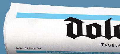 Versandart: alsBeilageinder Samstagsausgabeder„Dolomiten“ Privacy: AthesiaDruckGmbHhatgemäß Art.37derEU-Verordnung2016/679(GDPR) denDatenschutzbeauftragten(DataProtectionOfficer,DPO)ernannt.DieKontaktaufnahmefürjedesThemainBezugaufdie VerarbeitungderpersonenbezogenenDaten istüberdpo@athesia.itmöglich.