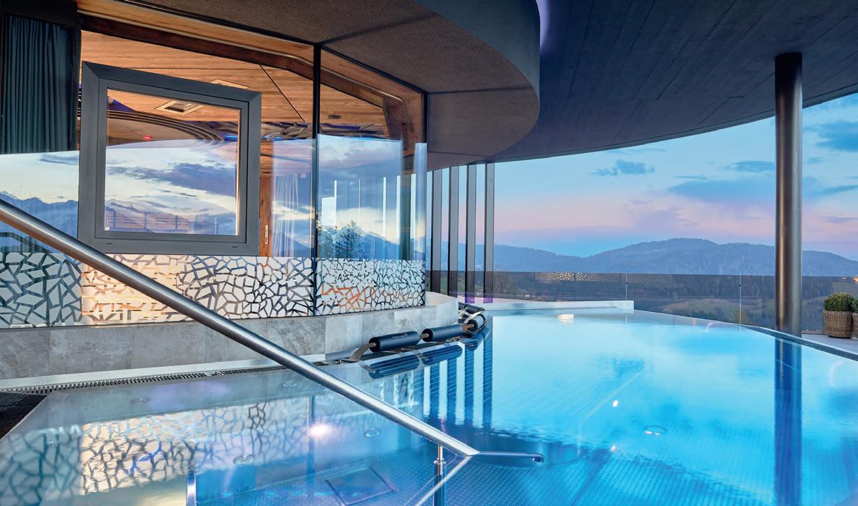• Luxus-Infinity-Whirlpool (8 x 5 Meter) mit traumhaftem Dolomitenblick und 36 Grad warmem Wasser;