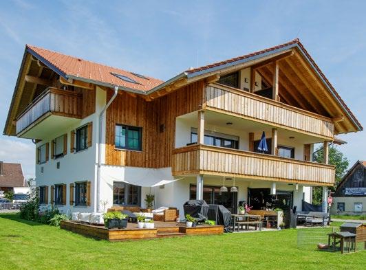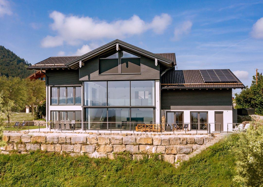 mit Naturstein verkleidetes Erdgeschoss und eine Fassade im Dachgeschoss mit Lärchenbrett, dazu modernste Haustechnik.