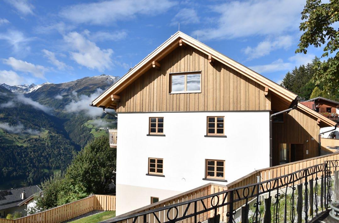 zu erhalten sowie besondere Wohnräume zu schaffen. Die Bestandskonstruktion der Tenne und auch der Dachstuhl im Wohnhaus blieben erhalten und verleihen den Räumen ein einzigartiges Flair. In der Tenne wurde das HausimHausKonzept umgesetzt, also neue, gedämmte Außenwände innerhalb der bestehenden Außenwände eingebaut. Besondere Fensterelemente öffnen den Wohnraum und gewähren Ausblicke auf die umliegende Bergwelt.