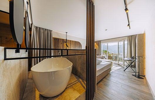 freistehenden Badewanne und 2 Zimmer mit einer privaten Sauna ausgestattet sind, die für zusätzlichen Luxus sorgen. Besonders hervorzuheben ist der gezielte Einsatz von Holz, das sowohl für Wärme als auch für eine natürliche Verbindung zur Umgebung sorgt und so eine luxuriöse, aber dennoch geerdete Atmosphäre schafft.