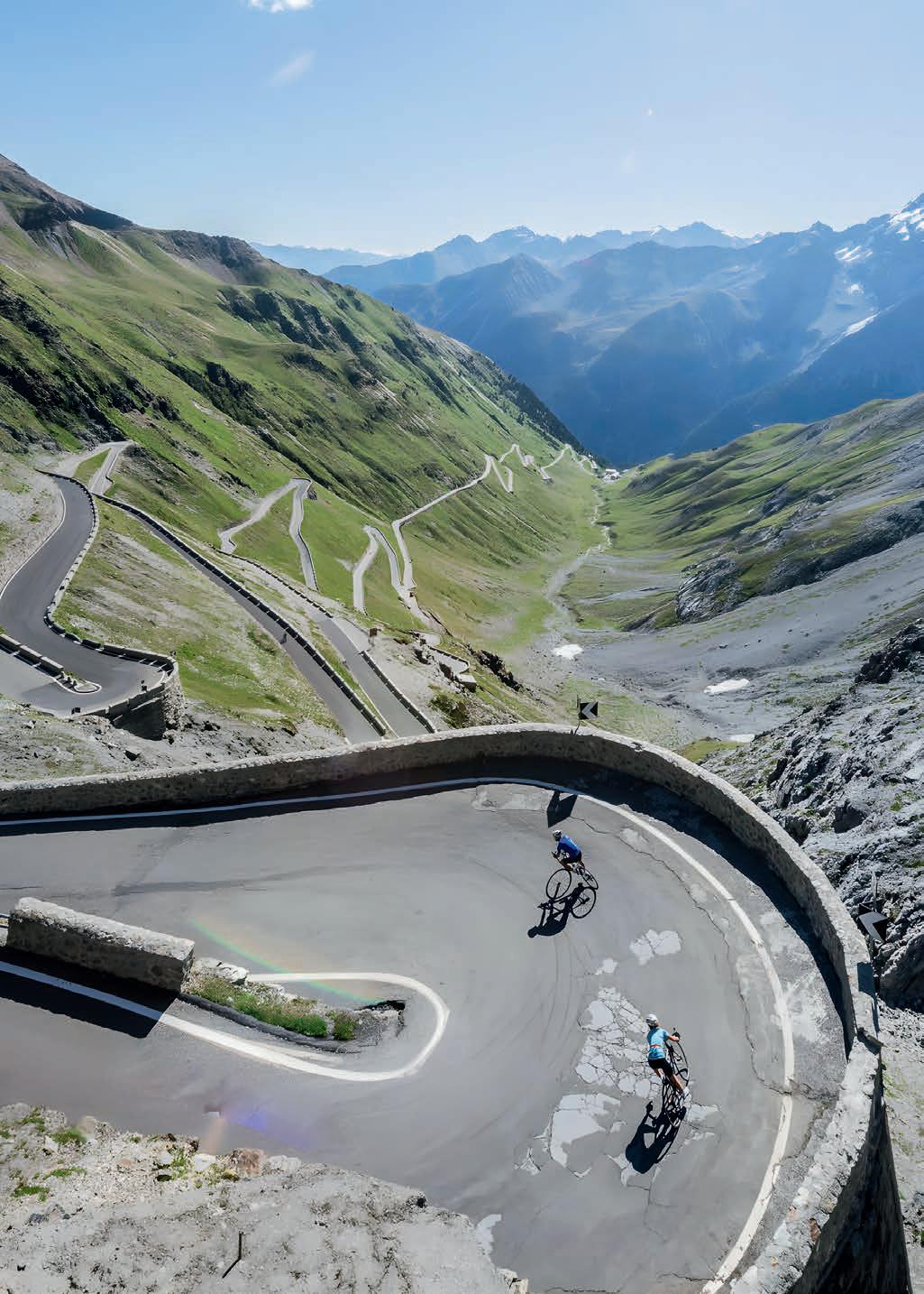 La strada del Passo dello Stelvio, con i suoi 48 tornanti sul versante altoatesino, è considerata una delle salite di montagna più spettacolari e impegnative al mondo. Il suo tracciato sinuoso è un punto di riferimento sia per la bellezza paesaggistica che per la sfida sportiva.