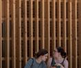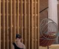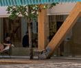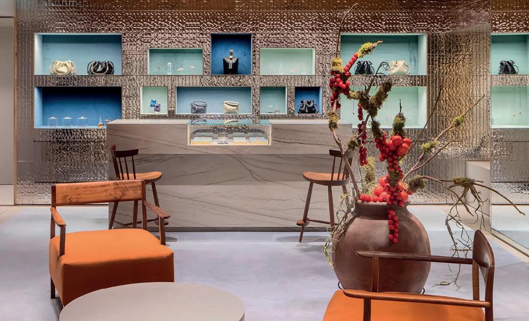 Das Innere des Ladens ist in Erdtönen gehalten, etwa handgefertigte Keramikfliesen an den Wänden in Braun-, Grün-, Weiß- und Silbertönen, die auf Marmor treffen. Decken- und Regalelement aus Eiche werden durch Details aus Messing und Beton ergänzt und mit Leinen und Samt kontrastiert.