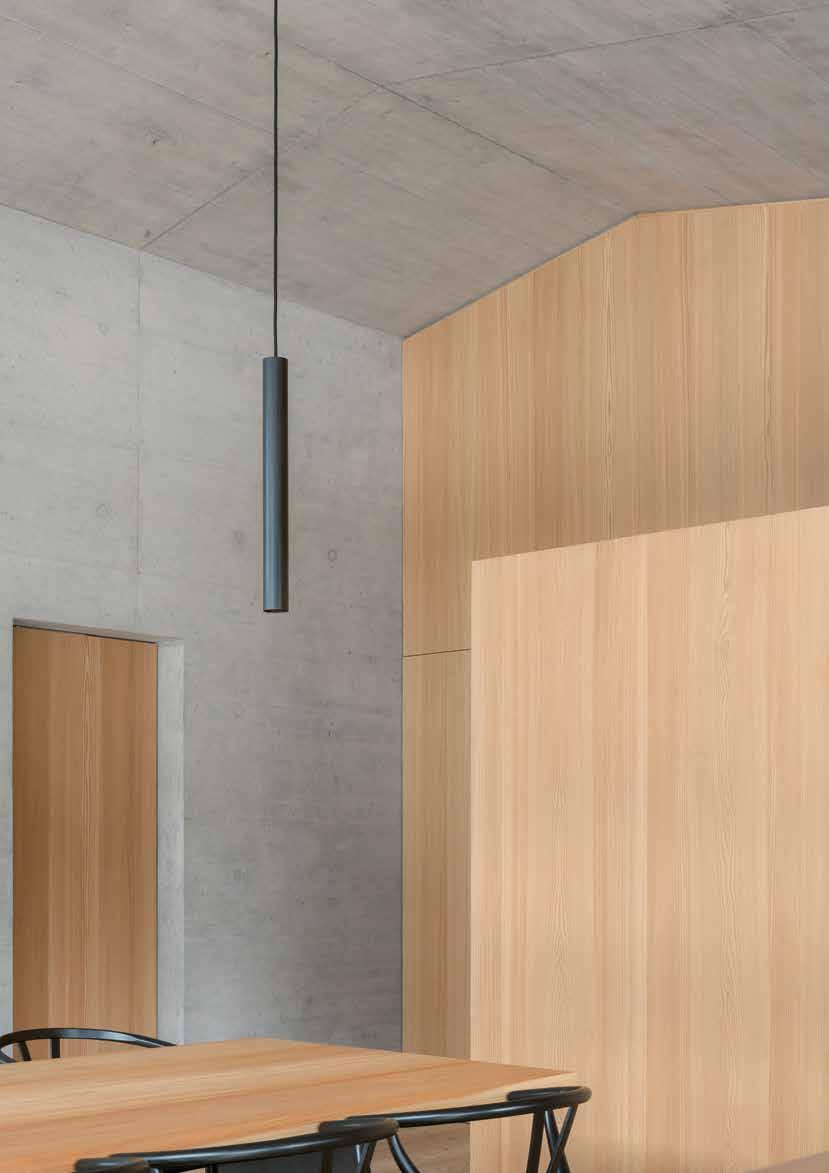 türen. „Damit es nicht so nach Küche ausschaut.“ Über dem seitlichen Element mit dem Spülbecken gewährt eine rahmenlose Fixverglasung samt kleinem Lüftungsfenster weite Ausblicke beim Arbeiten. Die Inox-Arbeitsplatte wiederholt sich beim Kochblock, der natürlich auch eine Betonhülle hat. Dazu kombinierte die Architektin einen Tisch aus 3massiven Lärchenbrettern auf Schwarzstahlfüßen. Schwarze Design-Klassiker runden den Essplatz ab.