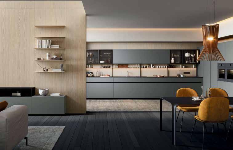 An der Vorderseite umfasst es einen Teil der Küche. Kaffeemaschine und andere Geräte samt Arbeitsfläche verschwinden hinter hohen Einschub-