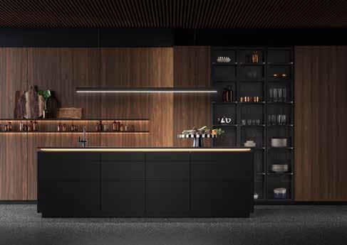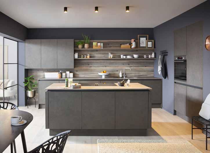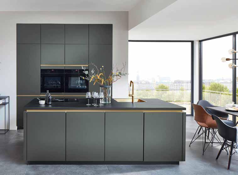 Insgesamt dominiert in der Küche 2024 ein weicher Look, das Kantige verliert seine Dominanz. Kochinseln werden abgerundet, und manche Spülbecken sind wieder kreisförmig. Ebenfalls rund sind die Armaturen. Nach all den Jahren mit grifflosen Oberflächen und Anti-FingerprintBeschichtungen feiern die Griffe 2024 ein Comeback. Die neuen Griffe sind echte Hingucker und haben neben ihrer Funktion noch eine Rolle als Designelement. Bei den Formen gibt es kaum Grenzen: Es gibt sie als Griffleisten und Bügelgriffe, als Stangen, als Knäufe und sogar als Schlaufen. Ganz ausgedient hat die grifflose Küche deswegen nicht. Wer besonderen Wert auf Wohnlichkeit setzt, wählt nach wie vor Fronten ohne Griffe. Schließlich feiert aktuell Cord nicht nur in der Mode ein Revival, sondern auch als Designelement. In der Küche konkret als Rillenoptik bei Küchenfronten. Diese vertikal strukturierten Fronten sind oft aus Echtholzfurnier gefertigt und entsprechend teuer. Günstigere Modelle bestehen aus Kunststoff in Holz-Optik. Doch ob Holz oder Kunststoff, die Vorteile sind dieselben: Vertikale Rillen kaschieren die Fugen von Türen oder Schubladen und verleihen der Küche deshalb einen gemütlichen Touch. Gemütlichen Wohnzimmercharakter verleihen der Küche auch die Pflanzen, die ‒ geht es nach den Trends 2024 ‒ Einzug halten. So lie -