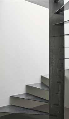 Direkt rechts neben dem Küchenblock liegt etwas Praktisches und Kunstvolles zugleich: die Treppe aus rohem Metall. Fast schon brutalistisch steht sie für sich. Doch trotz ihrer Härte ist sie enorm lichtdurchlässig und offen gestaltet. So erreicht auch der fensterlose Flurbereich im Untergeschoss Tageslicht und die Blicke werden automatisch nach oben zum Hauptakteur der Wohnung gelenkt. Thomas Egger war es wichtig, dass möglichst wenig vom Stufenaufbau selbst sichtbar ist. Das ist auch gelungen. Außer der mittleren Strebe verschwindet die restliche technische Konstruktion hinter einer Putzhülle in der Wand. Für den Betrachter geblieben sind nur die Auftrittsflächen. Trotz millimetergenauer Planung im Voraus war es dennoch beinahe ein Krimi, beim Einbau zuzusehen. Die Arbeiter hatten