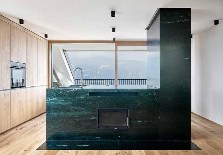 Eine Entscheidung war Egger bei der Planung besonders wichtig: Der Wohnbereich sollte glänzen. Und zwar mit Helligkeit und Offenheit und nicht zuletzt so ausgerichtet, dass die grandiose Aussicht auf den Kronplatz bestehen bleibt und regelrecht eine Bühne bekommt. So wurde eine Wohnung mit Charakter geschaffen. Eine, bei der der Wohn- und Essbereich mit gut 50 Quadrat metern die