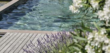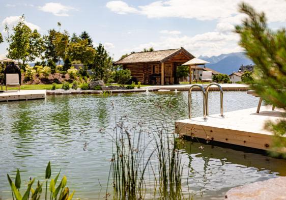 Umgeben von Grün und Bergpanorama bietet der naturbelassene Badeteich pure Erholung.