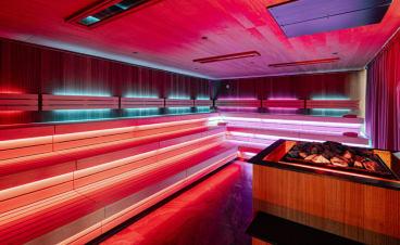 In der Eventsauna verbinden sich Wärme, Holzduft und sanftes Farbspiel zu einem befreienden Wellnesserlebnis, das Körper und Geist gleichermaßen entspannt.