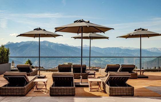 Auf der großzügigen Sonnenterrasse des Hotel Sonnenberg genießen Gäste die Ruhe und den Weitblick.