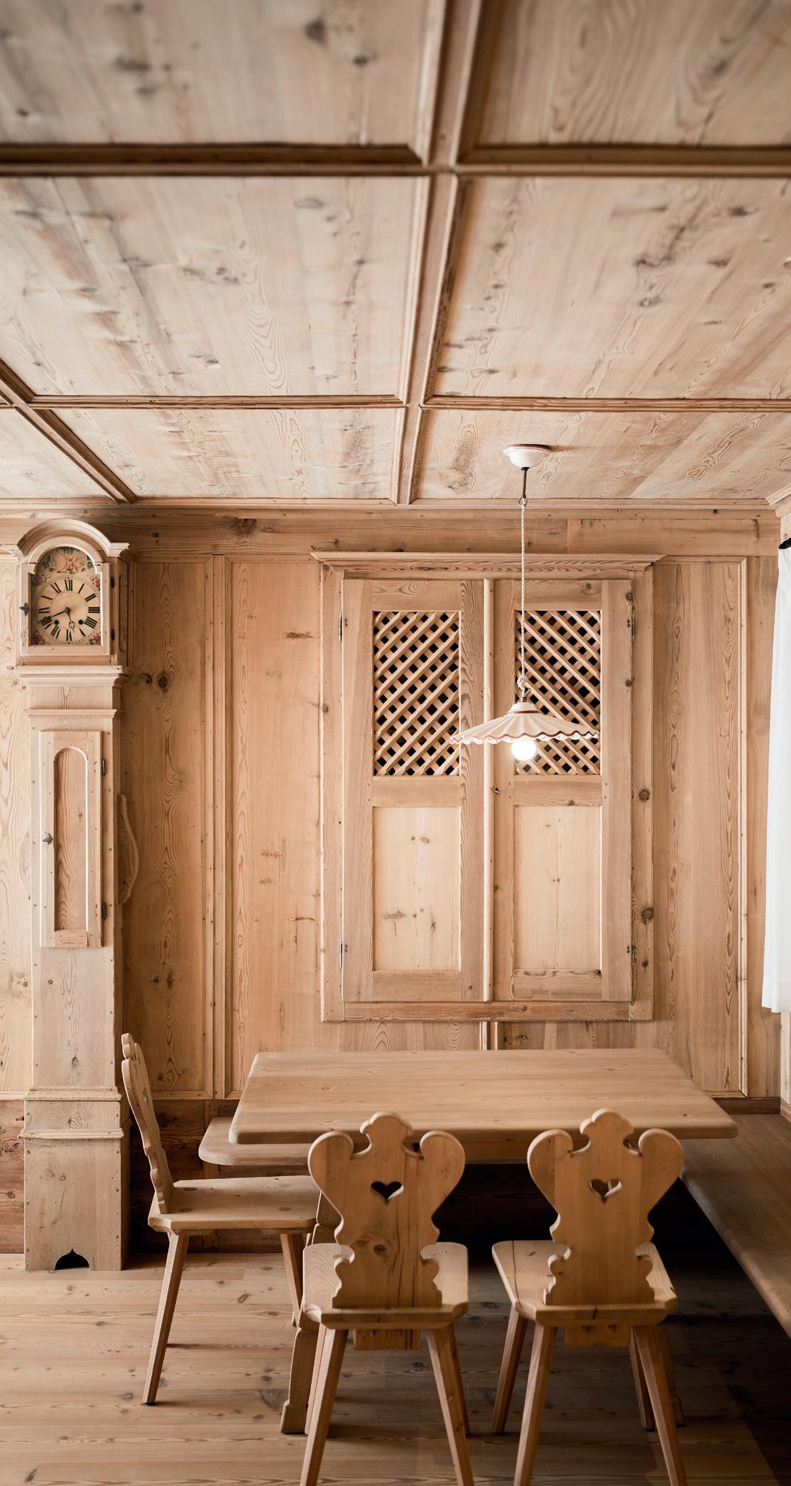 Hackschnitzelanlage, die ökologische Verantwortung mit hohem Wohnkomfort verbindet. Die Hackschnitzel stammen dabei zur Gänze aus dem eigenen Wald der Familie. Auch die Arbeit der Familie selbst, Hand in Hand auf Hof und Alm, macht die Authentizität spürbar: Gäste können den Alltag erleben, Tie re sehen, Käse probieren und die bäuerliche Lebensweise verstehen. Wo sich Vergangenheit und Neues harmonisch verbinden Der Wieserhof zeigt eindrucks voll, wie ein historischer Hof in die Gegenwart überführt werden kann, ohne seinen Charakter zu verlieren. Hier treffen historisches Ambiente und zeitgemäßer Wohnkomfort aufeinander. Dank der sorgfältigen Umsetzung durch Architekt Stefan Gamper konnte die Vision der Familie Fischnaller verwirklicht werden: ein Hof,