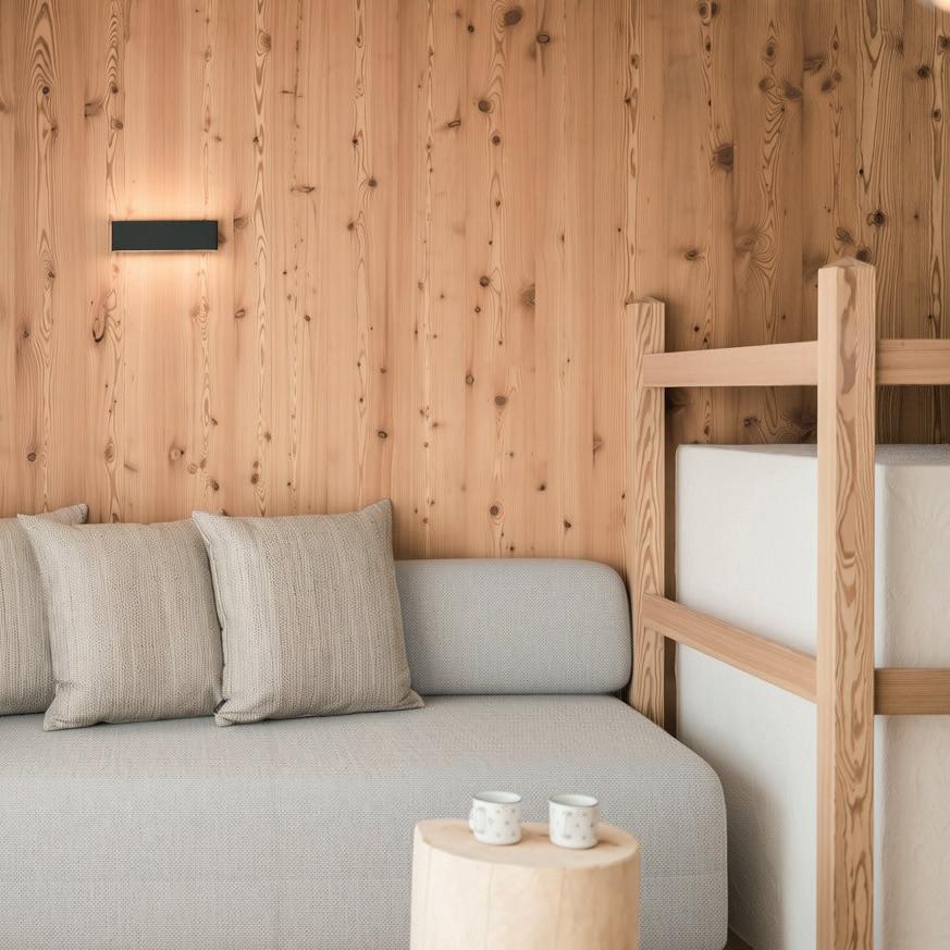 Ein Rückzugsort mit Charakter: Die kleine Sitzecke aus hellem Holz lädt zum Innehalten ein und unterstreicht die handwerkliche Qualität des Interieurs.